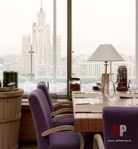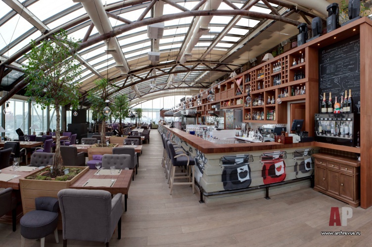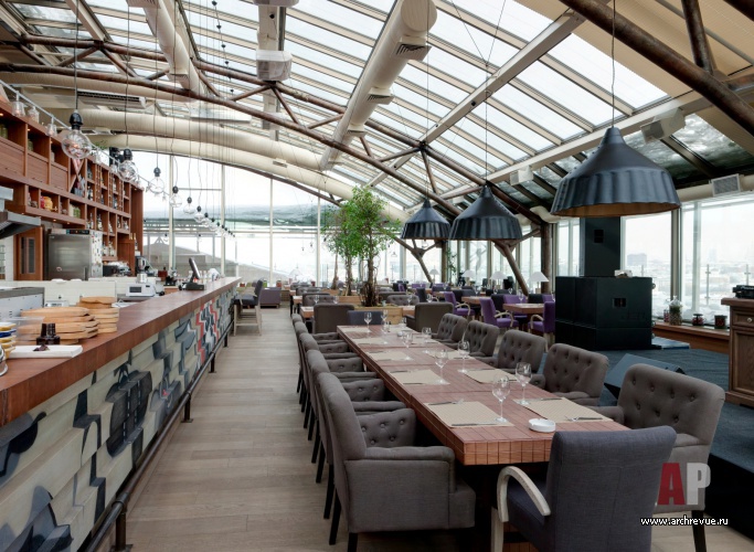 Динамику барной стойки поддерживает расположенный в центре основного зала стол на 16 человек со стеклянной столешницей. По периметру пространства расположена летняя веранда, открывающийся с нее вид на город – один из самых выгодных в столице.