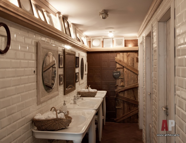 Акцент главного зала – барная стойка из декоративного бетона, расписанного в духе сказки «Малыш и Карлсон»: пропеллерами, банками с вареньем, городскими крышами… Сказочную тему продолжает отделка гардеробной, напоминающей дощатый домик с черепичной крышей, и санузлов, где есть дверь на крышу, за которой по легенде все-таки живет Карлсон.