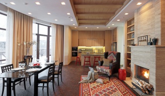 В решении гостиной применены цельные слэбы медового оникса, стена в спальне разбита дубовыми филенками на крупные ромбы. Значительная часть встроенной и корпусной мебели спроектирована в индивидуальном порядке.