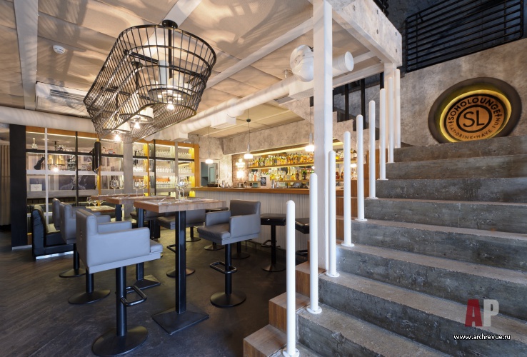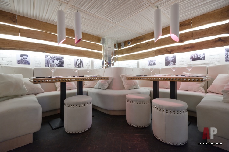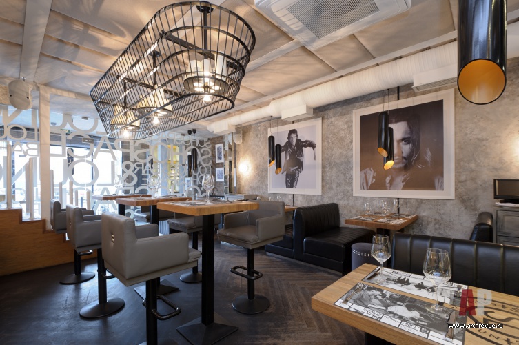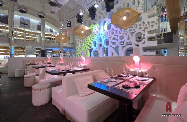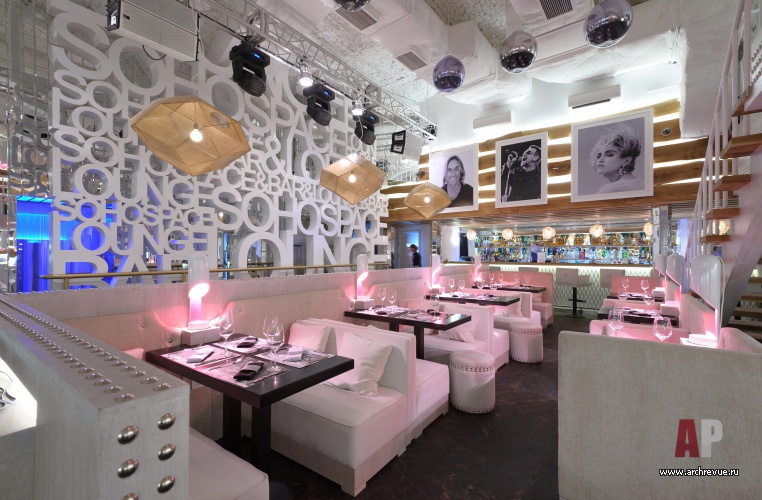 Ресторан с клубной составляющей занимает два этажа. Внизу находится бар с общим столом, акцентированным массивным светильником из металла, и основной зал клубной зоны. Пространство клуба продолжается на втором этаже, где значительную часть занимает лаунж. Главным элементом зонирования здесь выступает сложенная из букв стена, которая разделяет большое общее помещение.