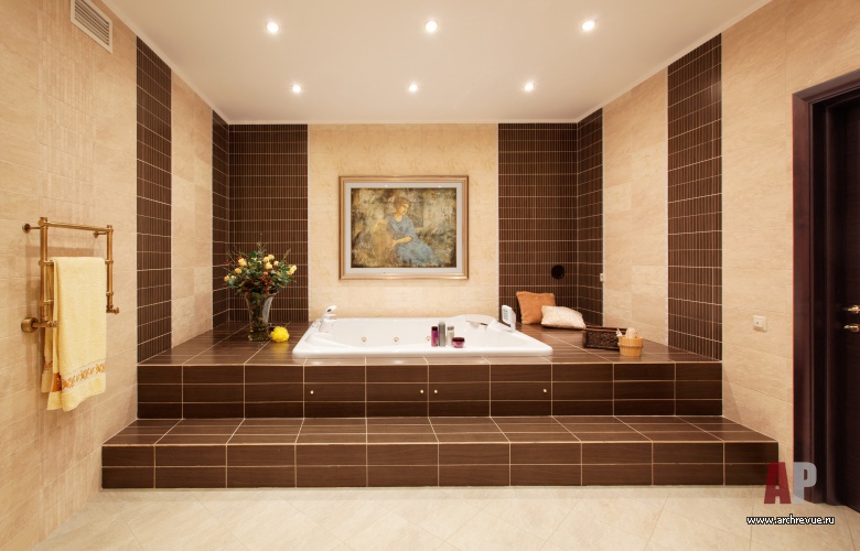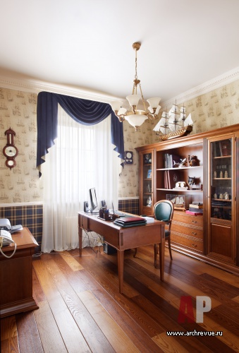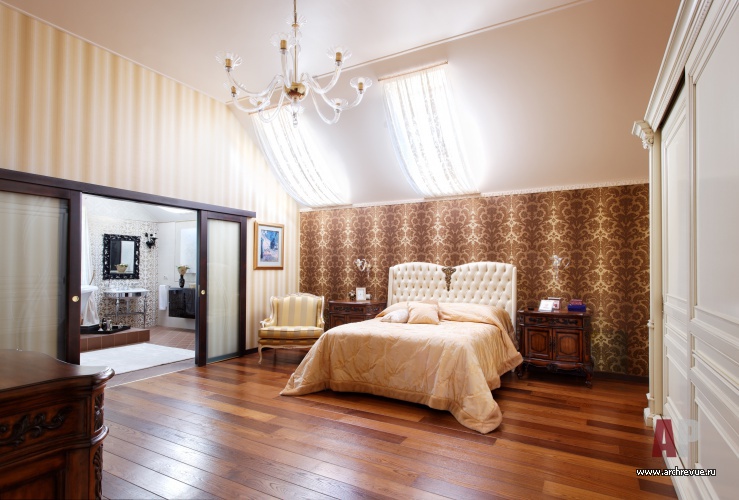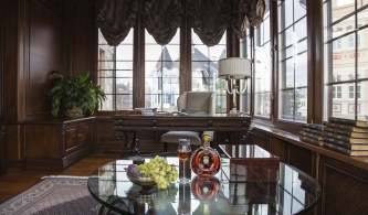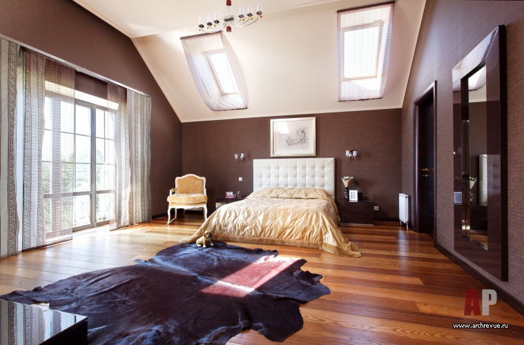 Рядом с лестницей на первом этаже также расположен кабинет и гостевой санузел. Вокруг холла второго этажа сгруппированы три разные по стилистике спальни со своими ванными и гардеробными комнатами. В цокольном этаже размещены помещения для отдыха: бильярдная и банный комплекс с большой ванной, двумя душевыми и сауной.