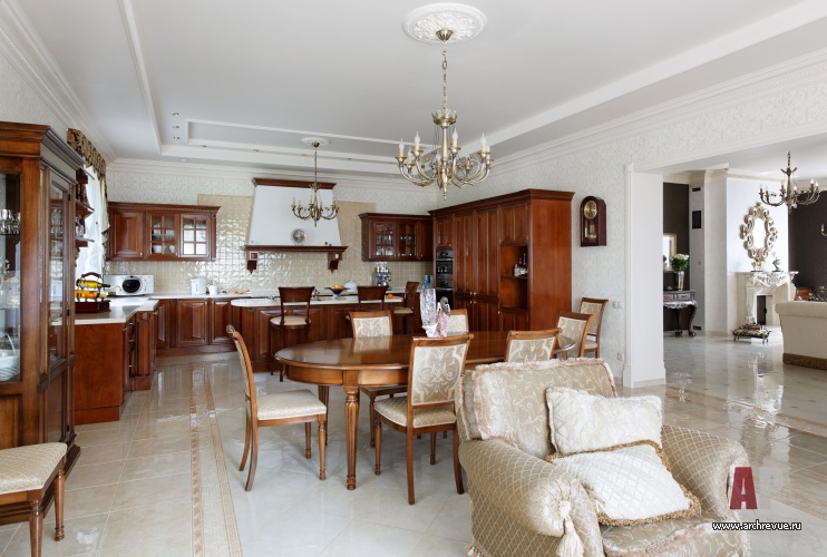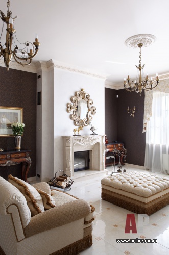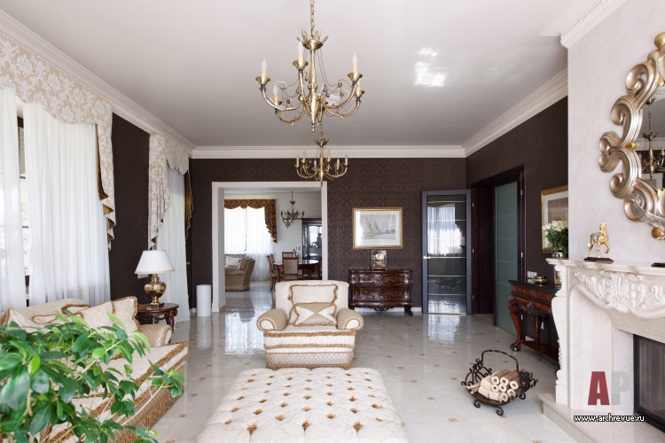 Первый этаж исполнен в стиле французской неоклассики. Светлый напольный керамогранит, достоверно имитирующий природный мрамор, и обои цвета темного шоколада с плотным орнаментом создают выразительный контрастный фон. Он выгодно оттеняет пышную респектабельную мебель, изысканную гипсовую лепнину и традиционный для европейских домов камин с резным каменным порталом.
