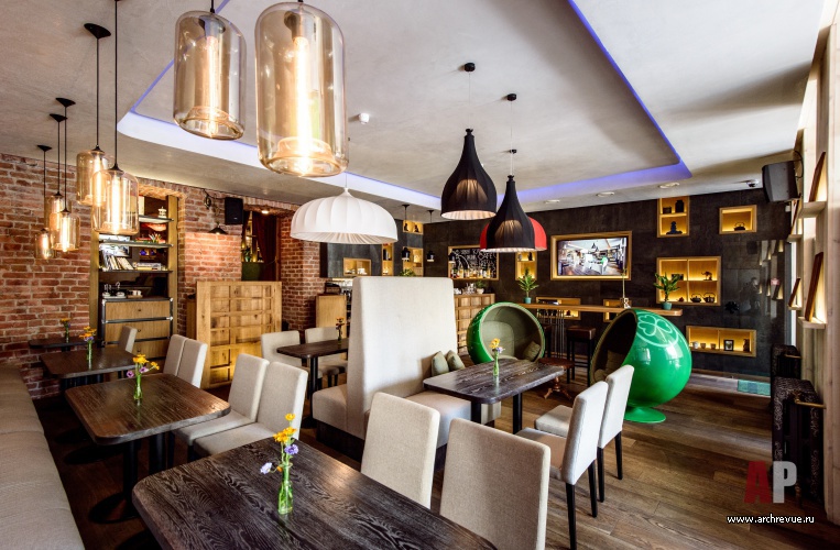 Эклектичный интерьер строится на сочетании красного кирпича стен, брутальных штукатурок и ярких дизайнерских предметов, в их числе ярко-зеленые кресла-шары от Cosmorelax. Эко-тема в интерьере реализуется благодаря использованию натуральных материалов с природной текстурой: панелей из шпона сланца, некрашеного дерева, составов с имитацией бетона.