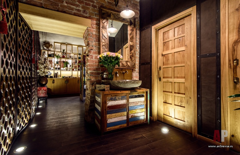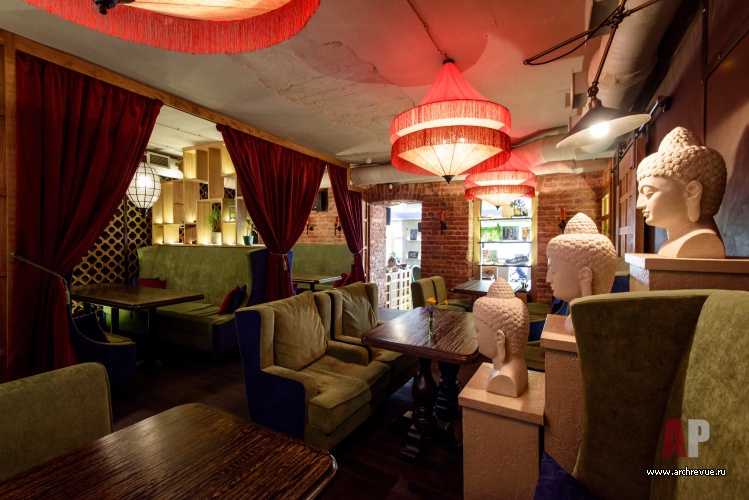 Вся мебель и декоративные панели и перфорированного дерева сделаны на заказ, гипсовые головы Будды вносят восточную ноту.