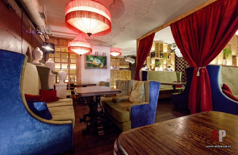 Кафе занимает два зала: светлый, обеденный с баром и большими уличными витринами и расположенный в глубине помещения затемненный кальянный зал. В кальянном зале царит камерная атмосфера, располагающая к уединению, что еще более подчеркивается тяжелыми плотными шторами, которые при желании можно задернуть, и мягким, приглушенным светом.