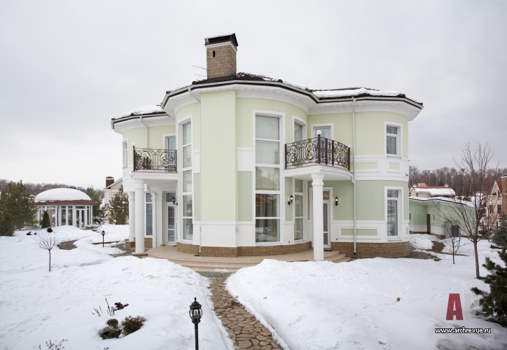 Супружеская пара пригласила архитектора Екатерину Петросян для оформления и создания уютной жилой среды в уже готовом доме. Исходная ситуация вызвала только позитивные эмоции: трехэтажный статный особняк, классическая планировка, двусветная полукруглая гостиная, высокие витражи настраивали на парадный лад. Снаружи дом с округлыми эркерами и поддерживающими балконами колоннами также был всем хорош, кроме цвета – ярко-желтого, кричащего.