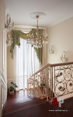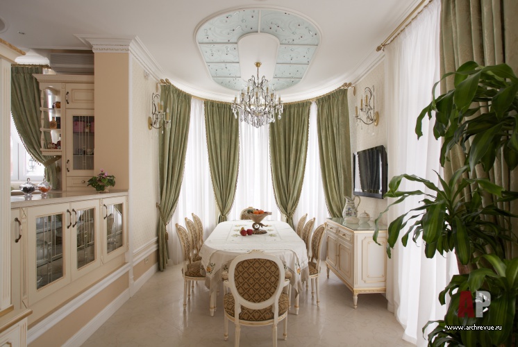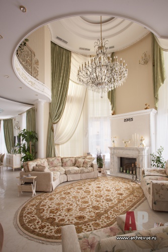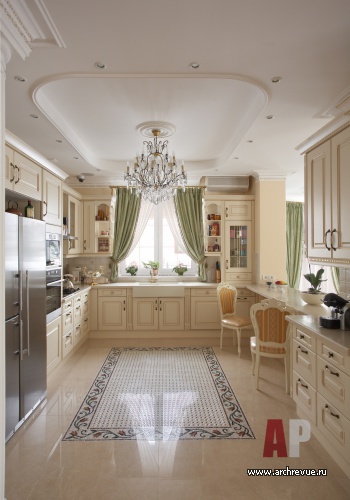 Благородная пастельная палитра экстерьера дома во многом определила облик его интерьеров. К нежной фисташке добились теплые оттенки слоновой кости, приглушенного золота, спелого персика. Светлая цветовая гамма во многом определила стилистику в духе французской классики. Кресла а-ля Людовик XVI, обои в стиле шинуазри, кухня с атмосферой прованса, восточные ковры и гобеленовые обивки задают тон в декоре первого этажа.