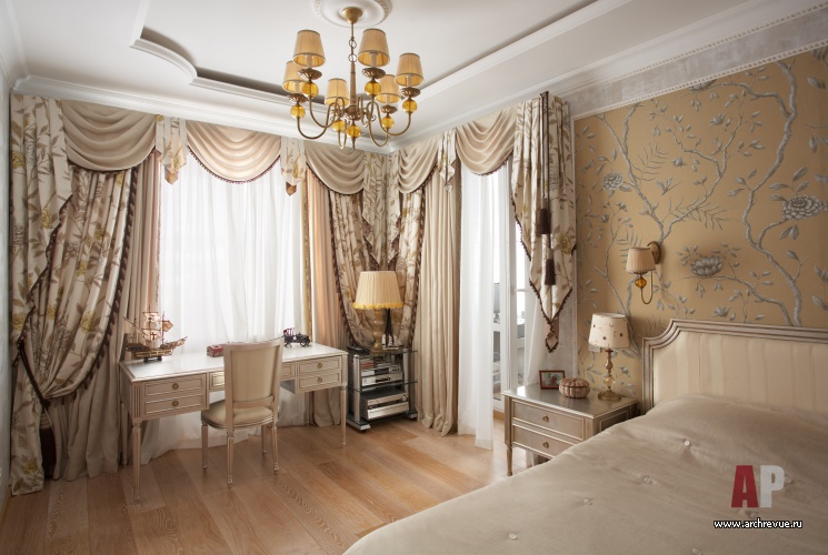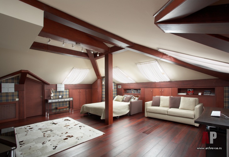 В приватных помещениях классическая тема выступает в чуть более облегченном виде. А в интерьере мансарды, и вовсе, сменяется современным декором с акцентом на фактуру красного дерева.