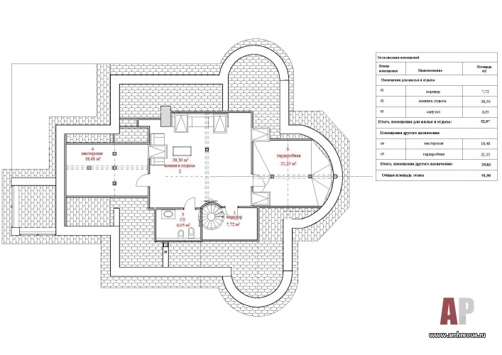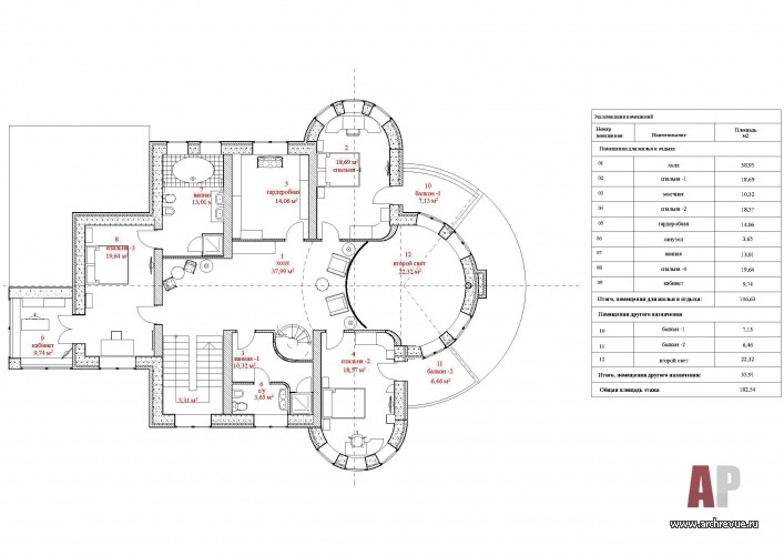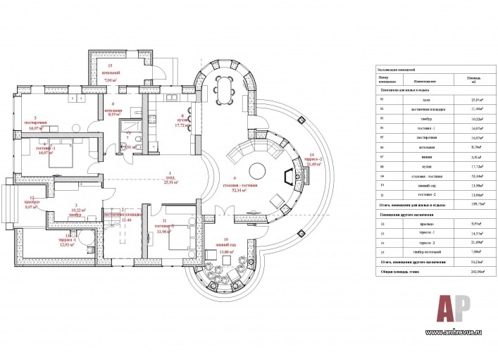 В основу планировочного решения дома положен классический принцип симметрии. По центральной оси первого этажа выстроены парадные гостевые помещения: холл, перетекающий в гостиную со вторым светом и центральным камином. По обе стороны от нее в полукруглых эркерах находятся столовая, совмещенная с кухней, и зимний сад. По обе стороны от холла организованы гостевые спальни и технические помещения с котельной.