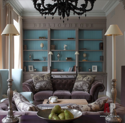 Гостиная библиотечные шкафы, консоли сделаны на заказ по эскизам архитектора, компания «Артим»; диваны – WR; стол журнальный «Детали»; кресло Marie`s Corner