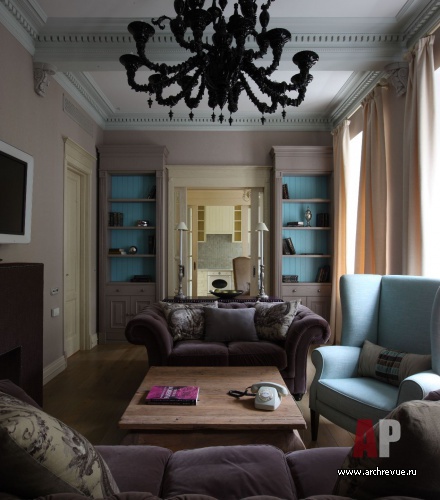 Основное настроение в интерьере задали два лиловых дивана в гостиной. В поддержку к ним появились бирюзовые стены. Лиловый с бирюзовым – необычайно красивое сочетание, которое, в сожалению, довольно редко используется в интерьерах. Цветовая палитра спальни также складывается из предметов этих двух цветов и сложных бежевых оттенков.