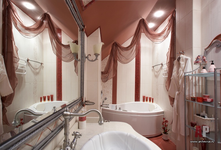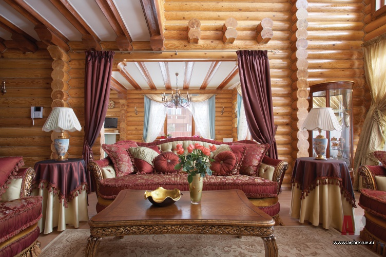 Интерьер деревянного дома решен в современном классическом стиле. С бревенчатой кладкой стен медово-янтарного цвета сочетается пышная мебель Provasi, яркие ткани с богатыми фактурами, хрустальные светильники. С живой фактурой дерева перекликаются изделия из природного камня, кованого металла, кожи, а также виражи и ручная роспись.