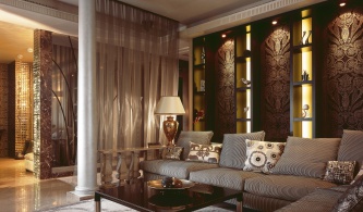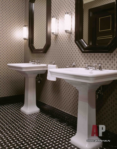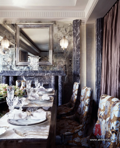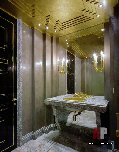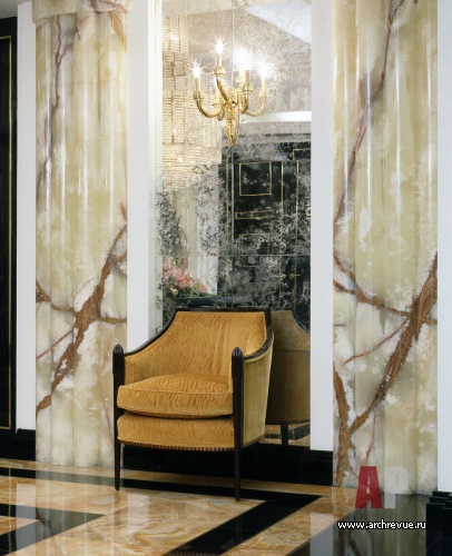 Создавая образ роскошного интерьера в духе 20-х годов ХХ века, декоратор сделал ставку на дорогие материалы с нетривиальной фактурой. Например, пилястры в парадном холле выполнены из монолитного оникса, лакированные двери украшены настоящими латунными вставками, пол выстлан бельгийский черным мрамором без единой прожилки, камин выложен из синего мрамора.