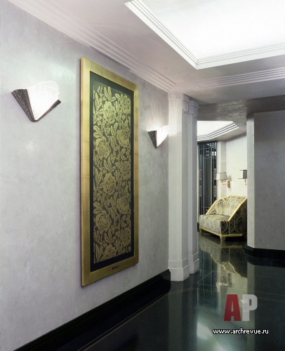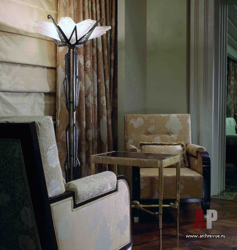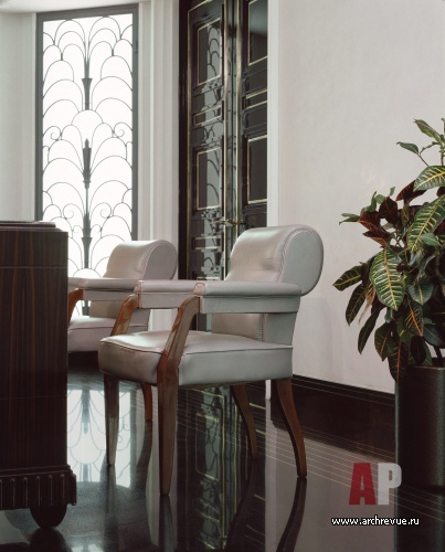 Интерьер офиса – не столько стилизация, сколько строгое следование канонам и кропотливая работа с первоисточниками. Шторы в кабинете сшиты из шелкового дамаста по эскизам Эмиль-Жака Рульманна, черные лакированные двери выполнены в духе работ Альберта Шпеера, дизайн гипсового плафона и торшера отсылает к произведениям Эдгара Брандта.