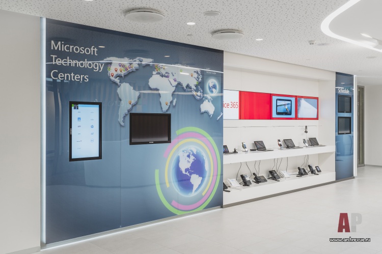 Новый технологический центр Microsoft в Москве задумывался как пространство для презентаций и продвижений новых продуктов и технологий, проведения лекций и тренингов, тестирования передовых решений и оборудования Microsoft. В проекте важно было реализовать две равнозначные функции – демонстрацию и обучение. При этом функции с одной стороны планировочно должны были быть автономными, но концептуально составлять единый «мир технологий Microsoft».