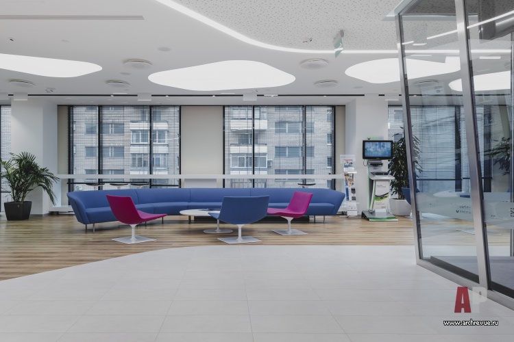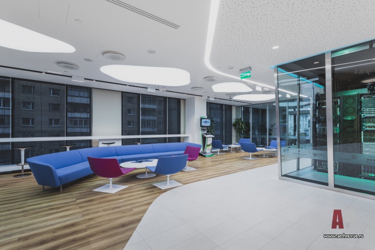 В центре П-образного плана располагается «космической» формы стойка ресепшен с вытянутой столешницей, переходящей в стойку hot-desk. Одной из ключевых деталей интерьера является стеклянная демонстрационная серверная с цветной подсветкой, вокруг которой формируется входной лаунж, где на столиках разложены для тестирования всевозможные цифровые устройства.