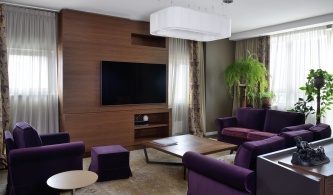 В оформлении пространства использованы символы, которые ассоциируются с передовыми технологиями и компьютерной техникой. В их числе: преобладание белого цвета в отделке, обтекаемый кориан, световые инсталляции (проекции на стойку ресепшен), ковролин в стиле 1960-х годов. Холод хай-тека смягчает дерево и мебель ярких цветов.
