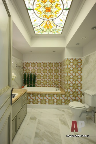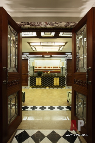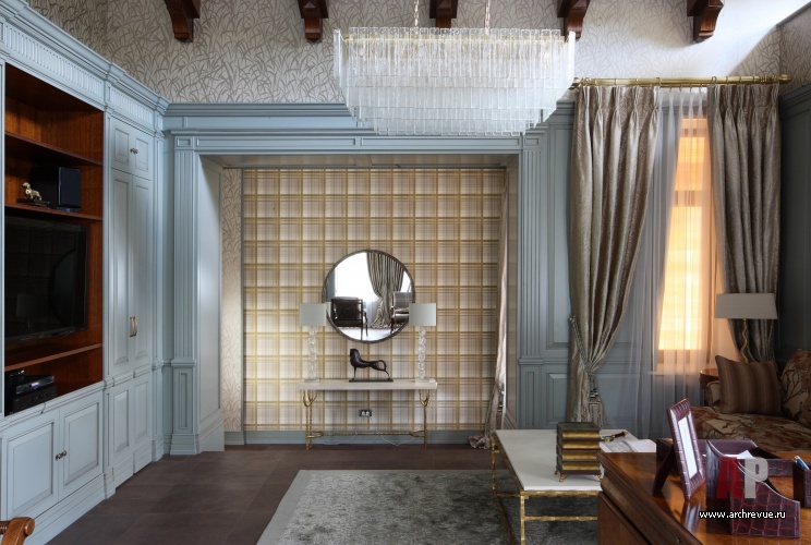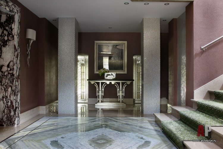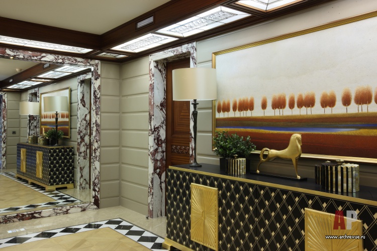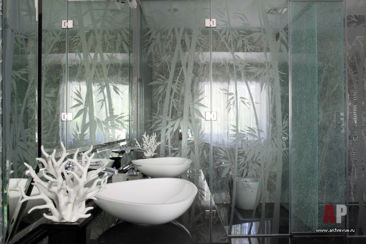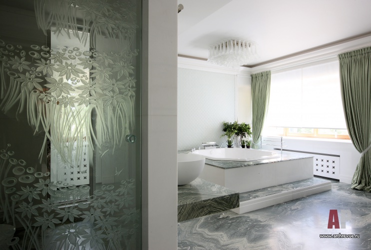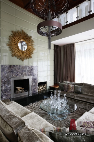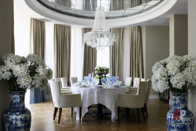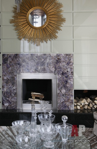 Со скульптурной резьбой по стеклу сочетаются изделия из таких роскошных материалов, как оникс, зеленый мрамор с волнистым рисунком, перламутровая мозаика, аметист (им обрамлен камин). Эксклюзивный текстиль, серебро, фарфор и живопись голландских, французских и немецких художников XVIII-XIX веков из коллекции хозяев завершают образ парадного семейного особняка.
