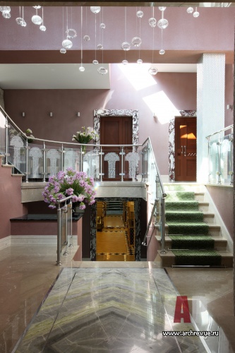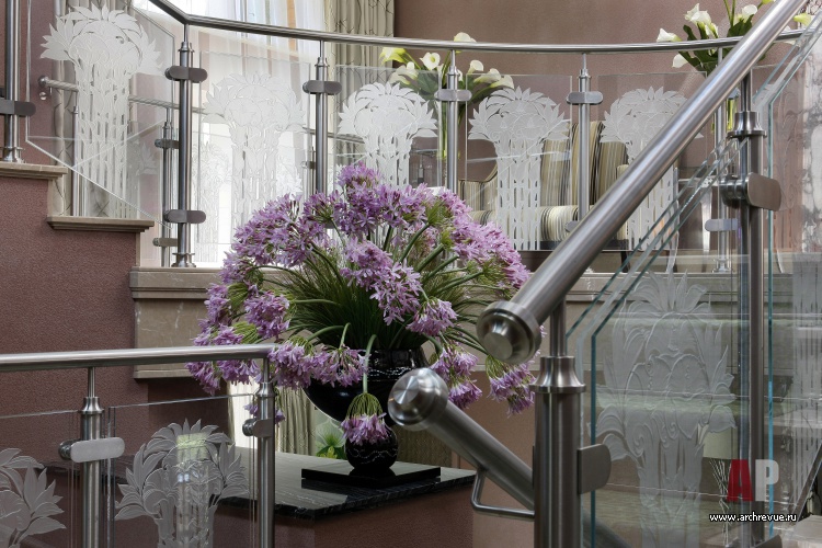 При работе над дизайном дома, авторы проекта стремились максимально высветить темные помещения и углы, впустить свет, дать воздух. Этой задаче прекрасно служат конструкции из стекла: окна, витражи, панно, ограждения лестницы и галерей верхних этажей. Для создания эффектного образа многие из них украшены цветочным рисунком, выполненными методом глубокой гравировки.