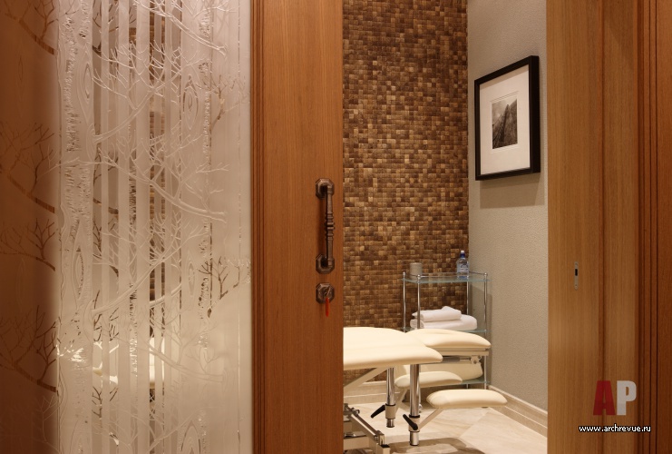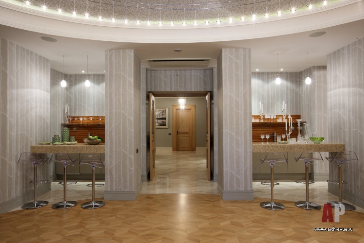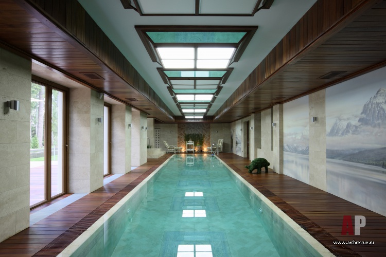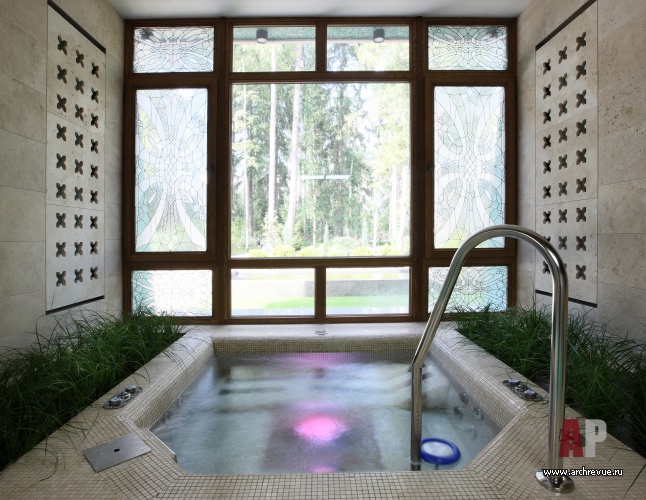 Два нижних уровня занимают помещения для отдыха и досуга: крытый семейный бассейн и еще ниже – банный комплекс, включающий хаммам и русскую баню, просторный тренажерный зал, массажную комнату, а также зал для занятий танцами и проведения семейных праздников. Из этого уровня можно перейти в подвал, где находятся винный погреб, в котором поддерживается специальный температурный режим, сервировочная и холодильная камера, предназначенная для хранения меховой одежды.