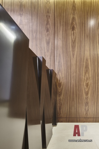 Графический ритм светлому интерьеру придают четко очерченные темно-коричневые рамы стеклянных перегородок. С этим ритмом рифмуются ряды линейных подвесных LED-светильников в темных корпусах, расположенных над рабочими местами. Один из основных мотивов, который архитекторы старались воплотить при проектировании всего офиса – ритм и пульс большого города. Наиболее показательно она реализована в оформление стойки рецепции. Сочетание наклонных плоскостей и встроенной в светопрозрачный кориан подстветки преобразует монолитную рецепцию в легкую и оригинальную конструкцию.