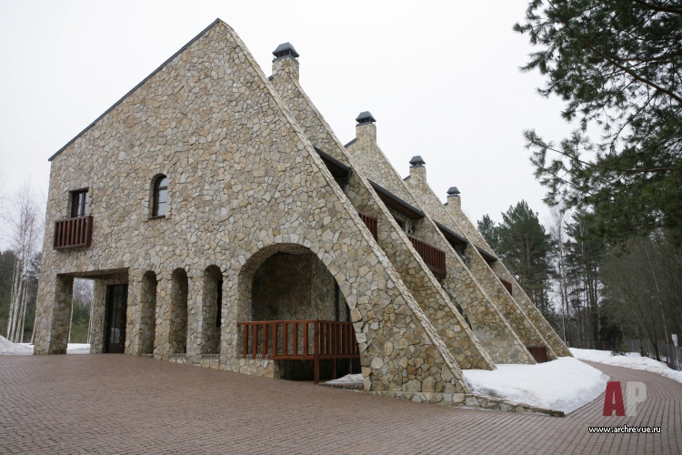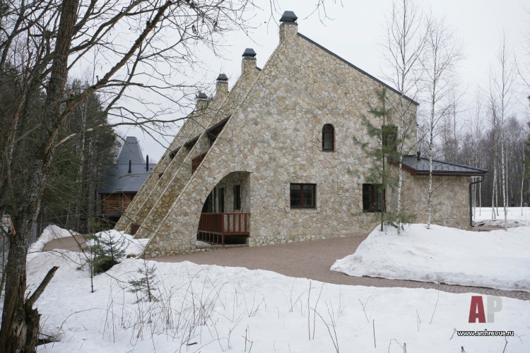 Гостевой дом издалека похож на крепость: он выполнен в традициях французской «деревенской» архитектуры, но сознательно преувеличенных, гиперболизированных. Здание облицовано натуральным камнем, который исторически используется в нормандском зодчестве. Его главный фасад, вдоль которого расположены большие оконные проемы, опирается на выступы-контрфорсы, характерные для сооружений готической эпохи. Благодаря им скатная крыша дома приобрела выразительный ритм, а конструкция здания – мощные несущие опоры.