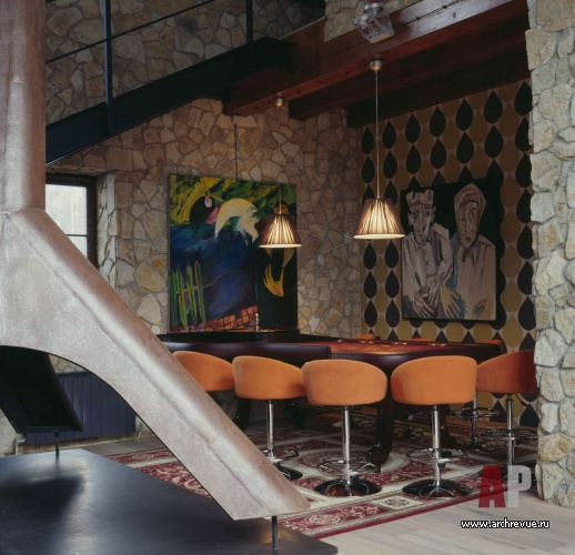 Одной из самых сложных задач в работе над проектом было найти сомасштабные пространству вещи. Отсюда и гигантский камин, размер топки которого вполне сопоставим с площадью кухни в советской квартире. Немалой площадью помещения обусловлен и размер обеденного стола на 10 персон, который хозяин приобрел в антикварном магазине.