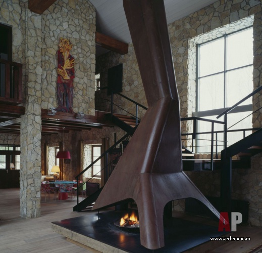 Общественная зона поражает размерами. Огромное пространство визуально разграничено на самостоятельные зоны. Яркая доминанта первого этажа – гигантский камин из проржавленного железа, на фоне каменной кладки он выглядит футуристическим исполином.