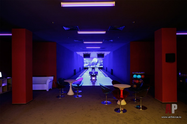 Каждая включает в себя небольшую прихожую, совмещенный санузел и спальню. В цокольном этаже разместился боулинг с мистически подсвеченными игровыми дорожками, дизайнерской мебелью и гигантским постером «Одалиски» Энгра на стене.