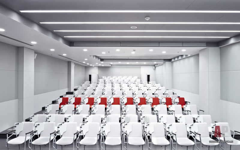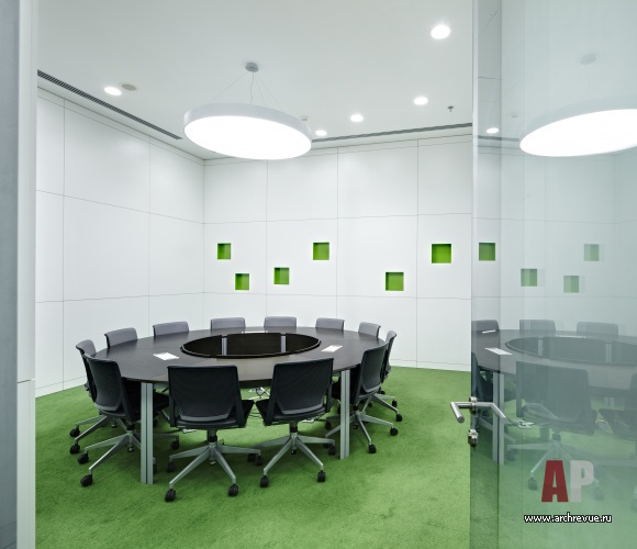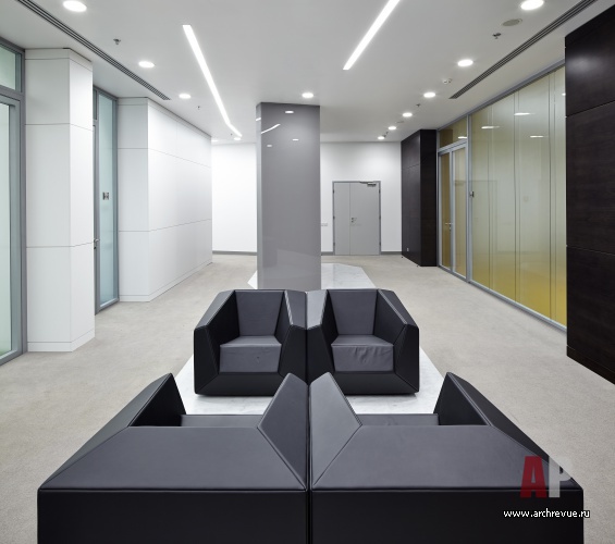Динамику в строгий облик помещений, заданный архитектурой здания, вносят стеклянные перегородки. Они располагаются под углом к внешнему остеклению и формируют уютные мягкие зоны для неформального общения. 8 этаж полностью занимает руководство банка, планировка включает: рецепцию для высокопоставленных посетителей, конференц-зал Совета директоров, ресторан с профессиональной кухней. Конференц-зал для крупных мероприятий расположен на первом этаже и имеет отдельные входы со стороны входной группы, рецепции и атриума.