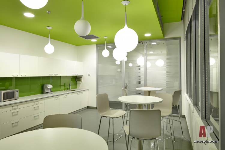 Разные цветовые решения воплотились в покраске потолков кафетериев, зон отдыха и переговорных комнат, в цвете ковролина и аксессуаров. Яркие акценты типовых рабочих этажей – перегородки, выполненные из разных материалов: ламината, ткани и стекла. В интерьерных решениях этажей VIP применены более спокойные цвета и отделка шпонированными панелями.