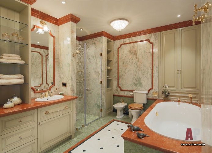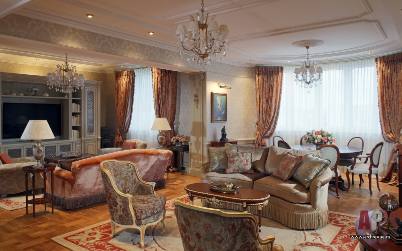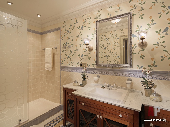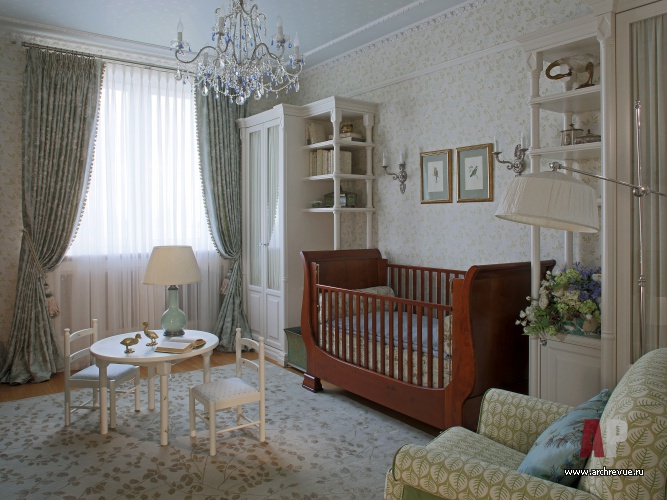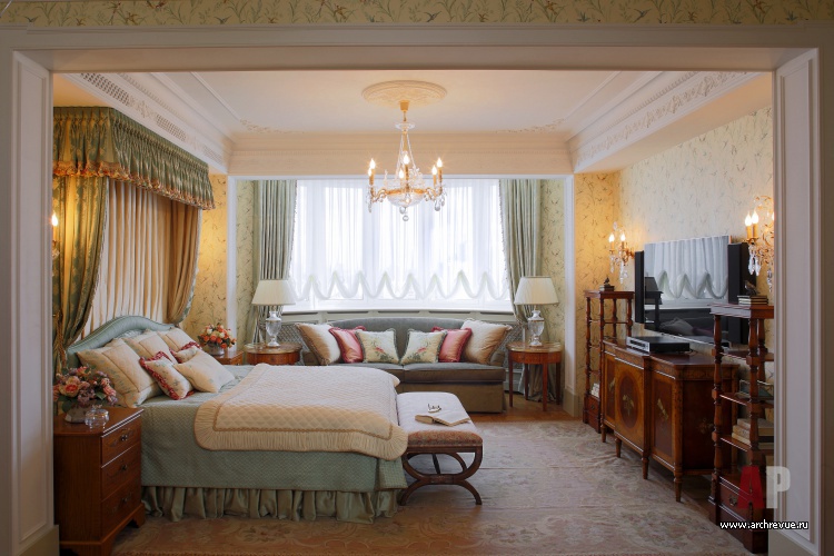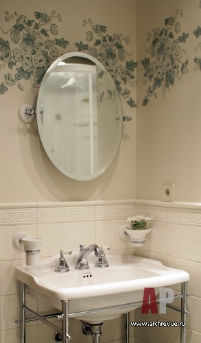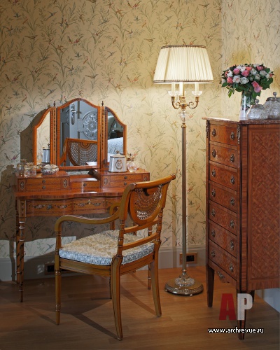 Парадное звучание интерьеру придает светлая цветовая гамма с теплыми нотами, мебель в стиле европейской классики XVII–XIX веков и изысканный рукотворный декор. В декоре стен жилых помещений использованы буазери цвета ореха и фисташки с легким золочением, а также обои с цветочным неоклассическим орнаментом.