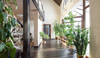 Элегантный образ достигается благодаря лепному декору с утонченным узором: колонн и пилястр с классическим капителями (они общую зонируют гостиную), тонких молдингов в отделке потолков парадных помещений, лепной сетки-трильяж – в прихожей. Теплоту и домашний колорит вносит текстиль с традиционными узорами и кирпично-красными оттенками.