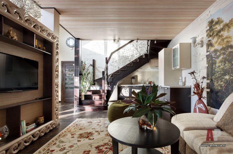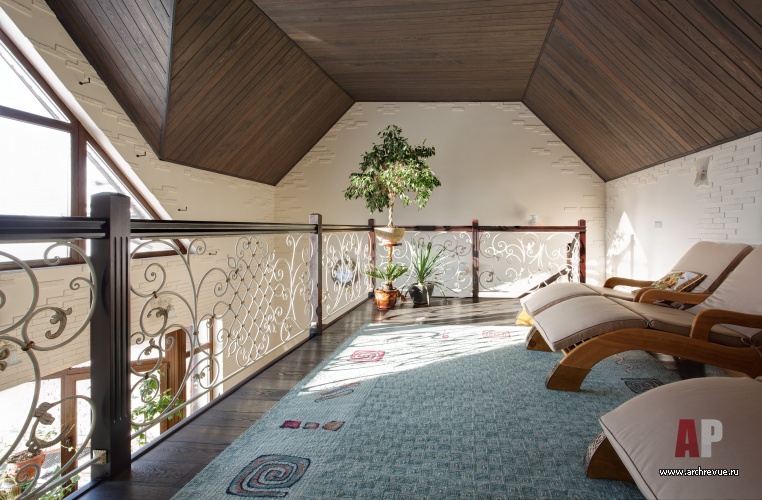 В декоре гостевой зоны акцент сделан на стилистику кантри. Стены дома с выступающим рустом отделаны белой штукатуркой, сложный по конфигурации потолок подшит темным деревом. В декоре присутствуют элементы осовремененной классики: ажурные крашеные в белый цвет кованые детали, фреска с пейзажем, резные деревянные детали. Благодаря стеклянному эркеру и обилию зелени интерьер напоминает средиземноморский курорт.