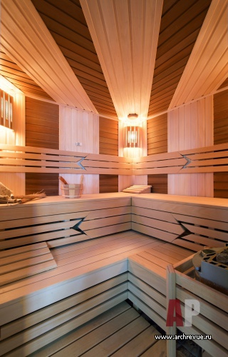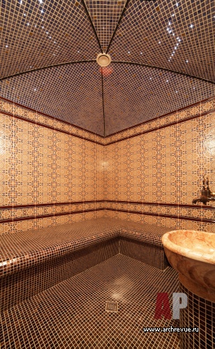 Помещение имеет форму многогранника, хаммам и сауна расположены друг напротив друга, между ними сделана душевая, которая их объединяет.