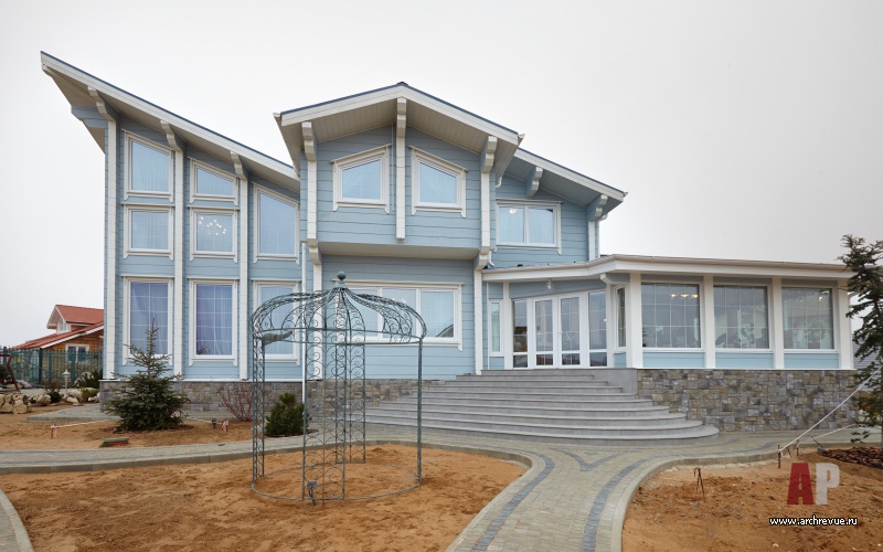 Свободное время и отпуск заказчики архитектора Екатерины Петросян любят проводить в путешествиях по большой и малой воде на яхте. Поэтому и в облике дома они хотели зашифровать любовь к морским путешествиям. Увлеченность морской стихией читается в архитектуре и самой конструкции двухэтажного деревянного здания с выдающейся остроконечной кровлей, а также в цветовом решении фасада, выкрашенного в серо-голубой цвет.