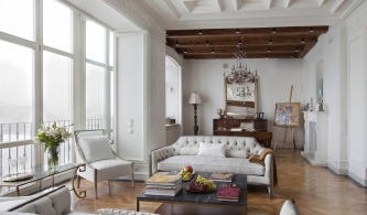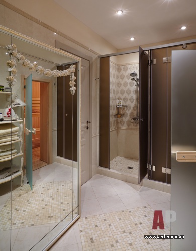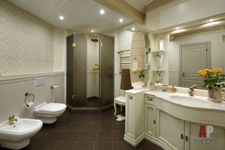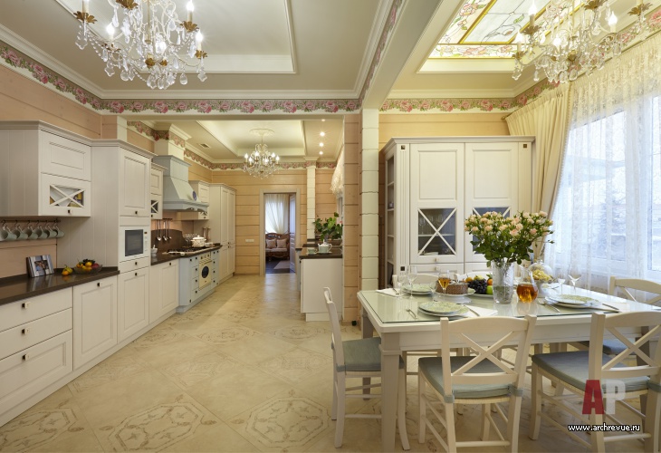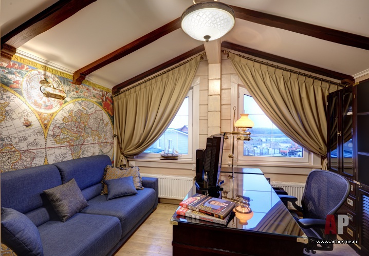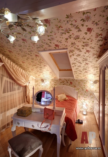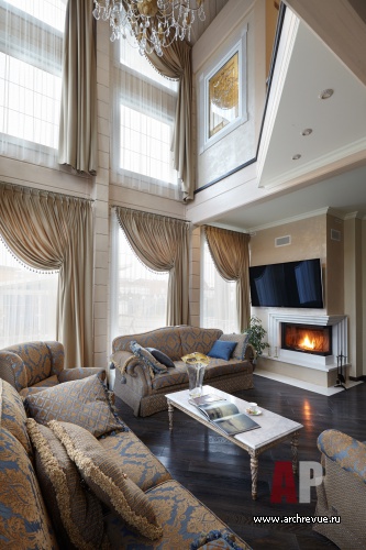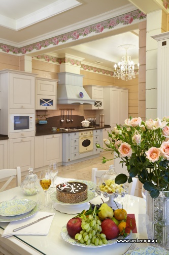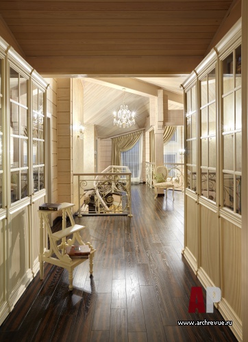 В ней разместили тренажеры и устроили зимний сад. На втором этаже расположена главная спальня с кабинетом и со своим входом в гардеробную и ванную, а также детский блок (три спальни и детская ванная). Приватные помещения объединены просторным холлом. Дом интересен еще и тем, что он имеет еще одну независимую часть со своим входом, где живут родители хозяев дома, и включает гостиную, спальню, кухню и небольшую ванную. Эта часть дома оформлена в традиционном классическом стиле, с позолоченной лепниной и тяжелой классической мебелью.