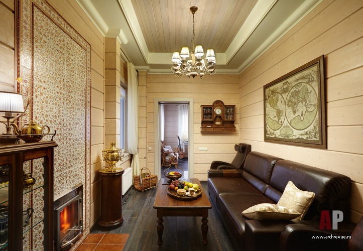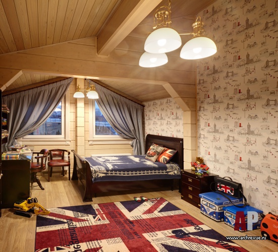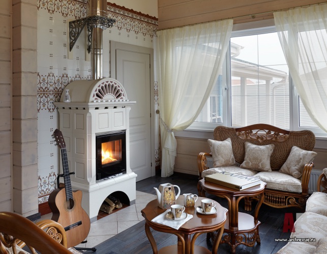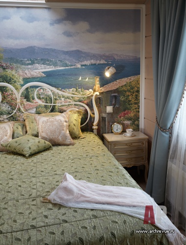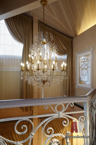 Нежный бирюзовый цвет присутствует в мебели, обивке диванов и текстильном оформлении комнат. Растительный орнамент обоев и ажурный рисунок ковки на лестнице, фрески, разбивают монотонный ритм горизонтальных полос дерева и украшают стены деревянного дома.