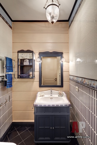 Интерьер деревянного дома вдохновлен средиземноморской культурой и архитектурой. Его первый этаж решен на контрасте темно-орехового пола и светло-золотистых стен. Второй, приватный, этаж исполнен в более спокойной золотисто-медовой гамме. В аксессуарах интерьера и в цветовом решении дома проскальзывает морская тематика.