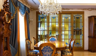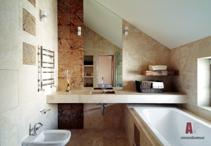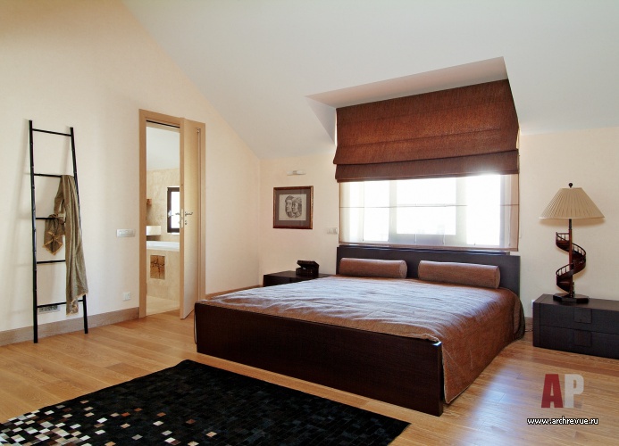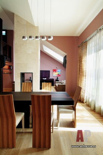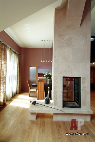 Под стать архитектонике пространства отделка помещений: высокий объем гостевой части отделан декоративными штукатурками и облицовочным кирпичом нейтрального цвета. Колонна каминной трубы облицована травертином, полы выстланы светлым дубом. С нейтральным фоном контрастируют конструктивные элементы лестницы и балкона второго этажа, мебель и ограждение антресоли из затемненного стекла.