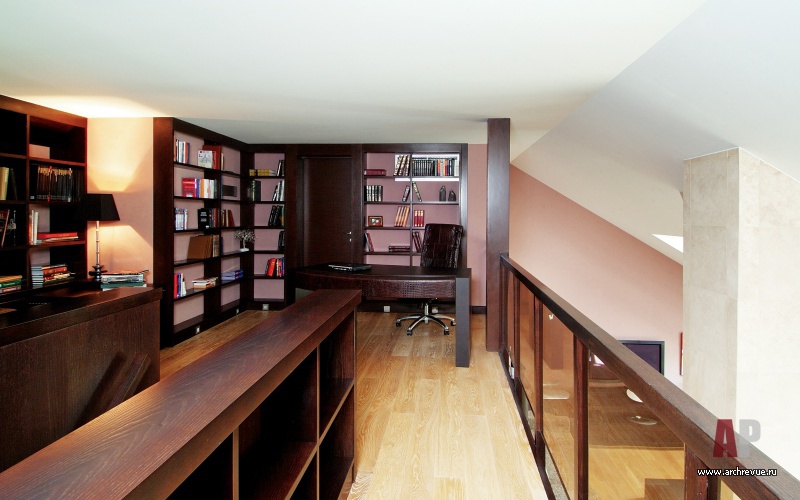Пространство имеет большую высоту и по своей архитектуре напоминает загородный дом. Спальня и детская изолированы от общей зоны и имеют потолки стандартной высоты. Смонтированная к стене минималистская лестница кажется парящей в воздухе, она ведет на второй уровень. Здесь под коньком кровли находится кабинет с библиотекой.