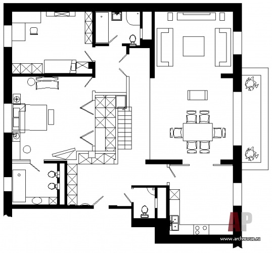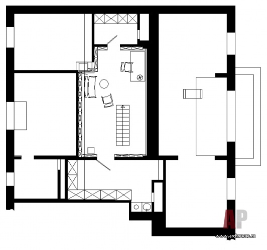 Высокое помещение под крышей с мансардным окнами было разделено на два уровня надстроенным антресольным этажом. Центральную часть первого этажа занимает студийная гостиная со столовой и кухней.