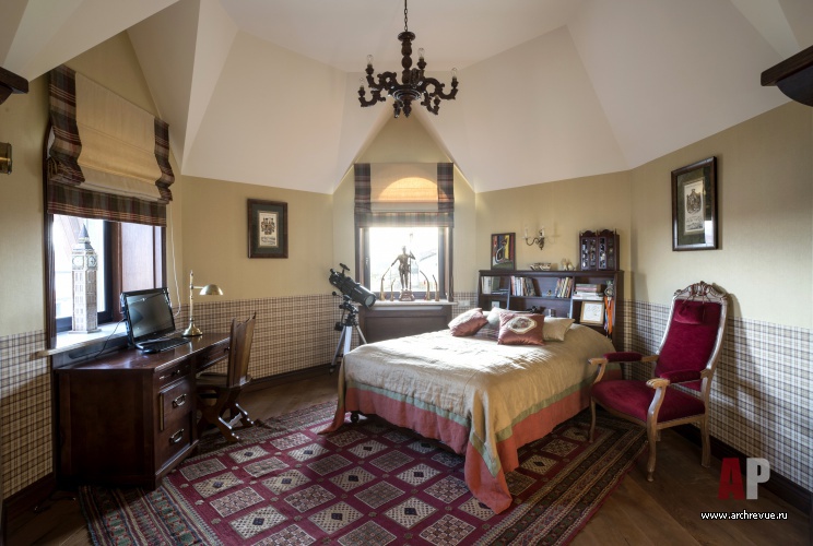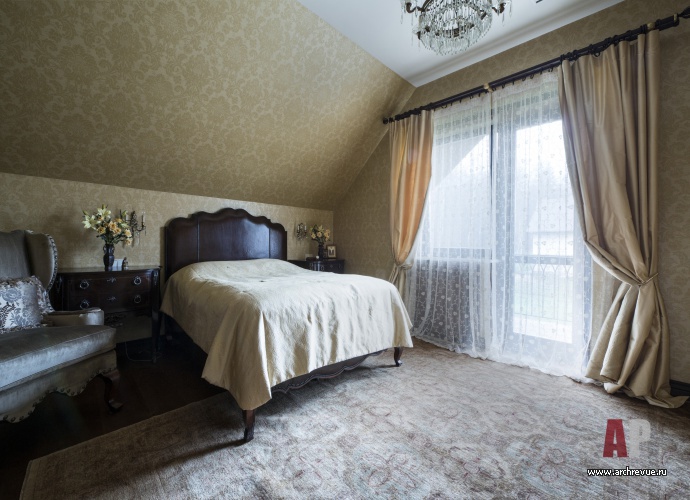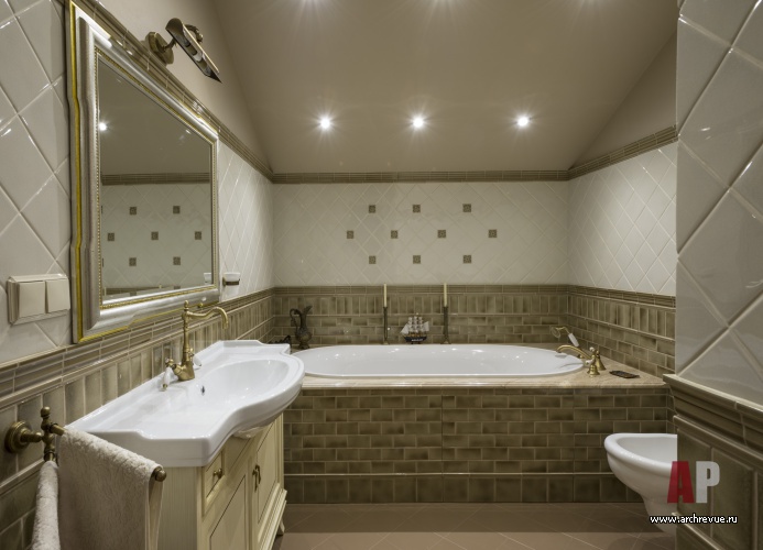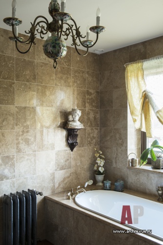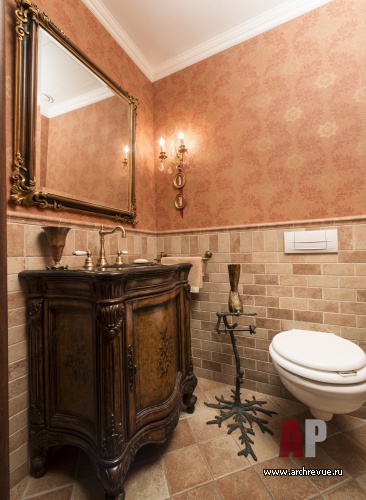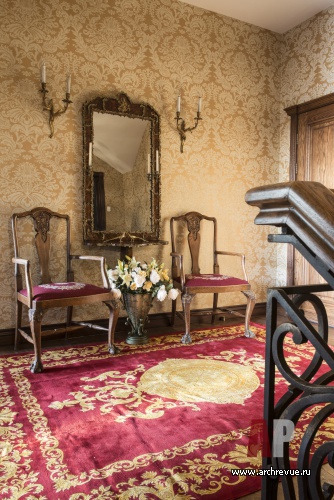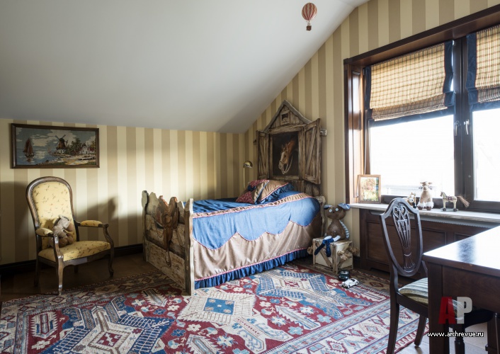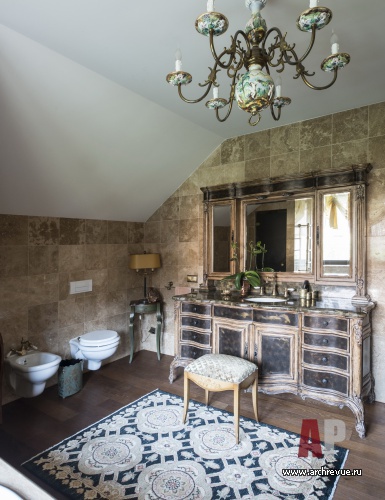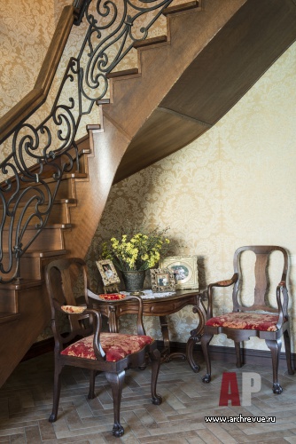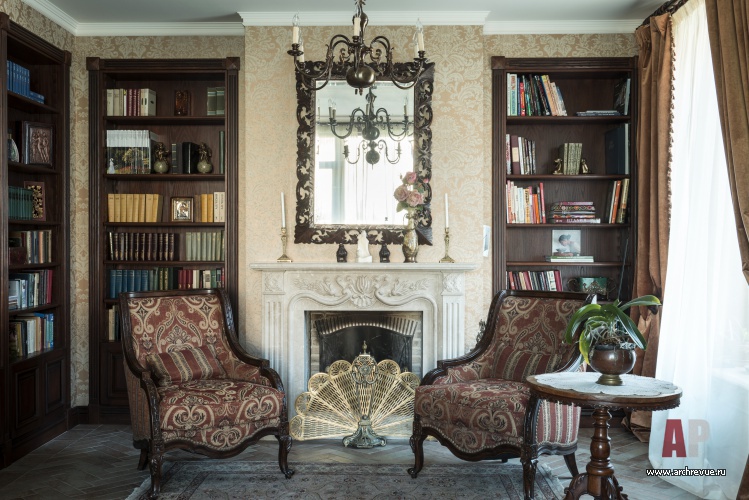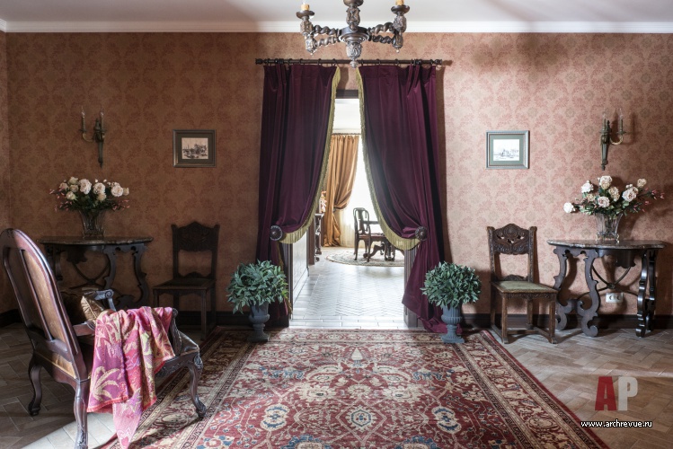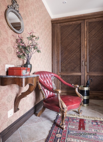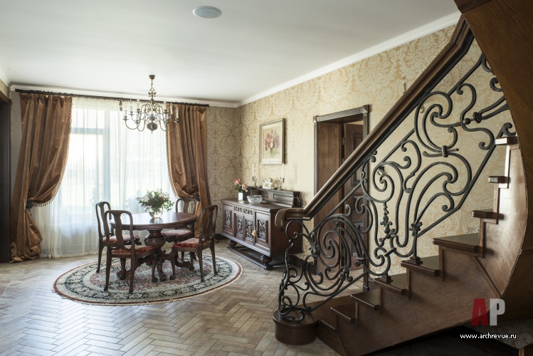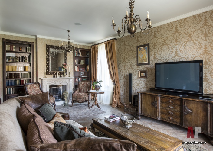 При декорировании интерьера дизайнер стремилась создать ощущение дома с историей. Выложенная елочкой плитка Tagina на полу отсылает к эстетике старинных европейских городов. Здесь зашифрованы отсылки и к мощеным тихим улочкам, и к каменным полам в средневековых замках. Черненые кованые элементы, авторские изделия из темного дерева, обои с рисунком «дамаск», каменный неофранцузский камин служат фоном для антикварной мебели.