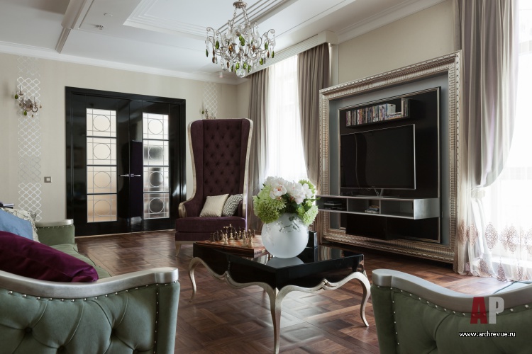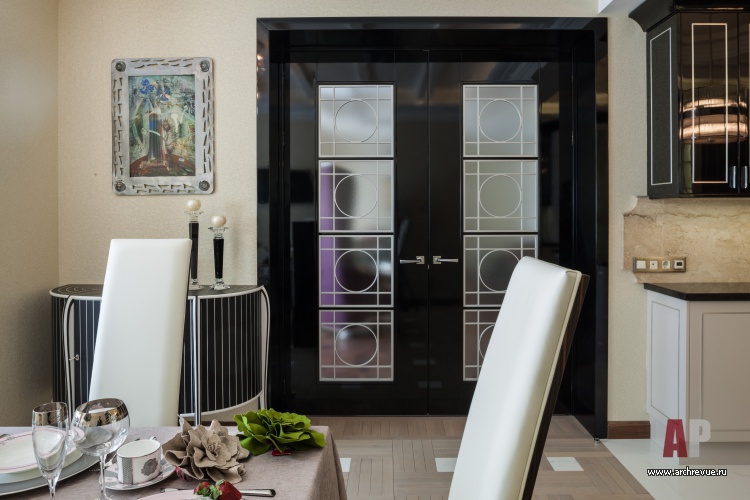Геометрические формы, черный лак и отделка серебром – типичные приметы стиля ар-деко. Важную роль в интерьере играют отдельные предметы мебели: кухонный гарнитур под рояльным лаком, кресла с огромными спинками, фантазийные диванчики, кровать с высоким изголовьем. Предметы необычные и роскошные и вместе с тем респектабельные и элегантные.