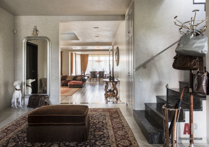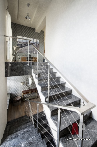 Заказчица приобрела уже готовый дом в подмосковном коттеджном поселке. Кирпичный трехэтажный дом был частично отделан изнутри: серые стены, кирпичные фрагменты, стеклянные перегородки – все отсылало к стилистике хай-тек. Однако на вкус хозяйки его современные интерьеры выглядели слишком строгими и неуютными. Именно с пожеланием сделать дом более теплым и привнести уют, она обратилась к дизайнеру Юлии Маркос, которая в свое время уже декорировала ее московскую квартиру и загородный дом.
