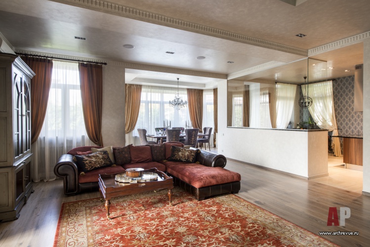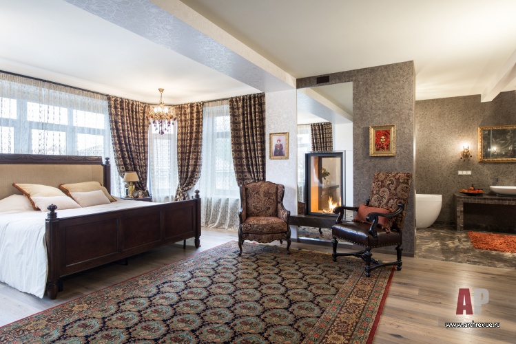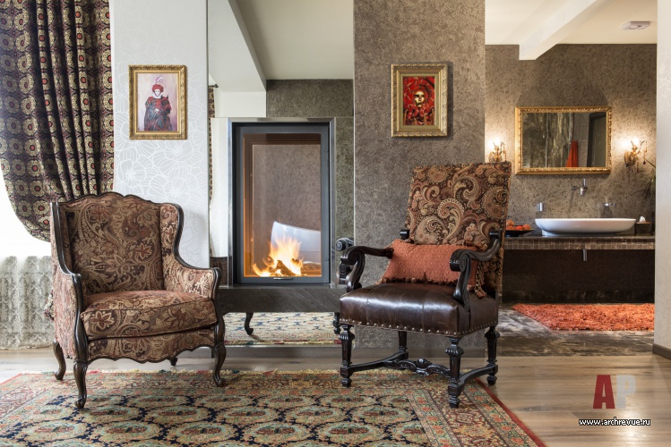 Оформляя интерьер дома, дизайнер использовала исключительно декораторские приемы и средства. Чтобы создать комфортную атмосферу, она выбрала материалы, которые ассоциируются с домашним уютом и теплой: обои, приятный на ощупь текстиль, изделия из дерева, американскую и французскую мебель неоклассических форм. Теплоту в изначально хай-течный интерьер вносят вписанные в архитектуру дома камины с живым огнем.