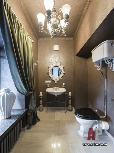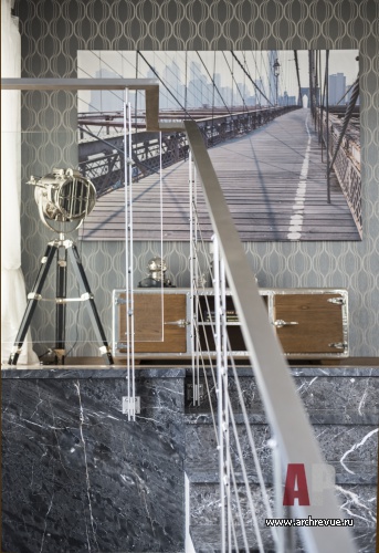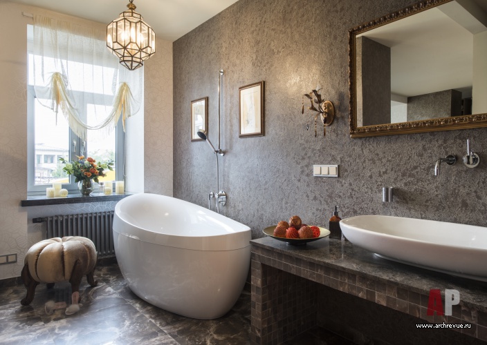 Лепные карнизы, обои, дизайнерские светильники делают холодный интерьер с обилием камня и стекла более обжитым.