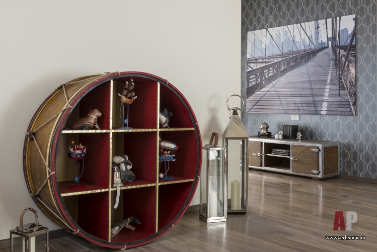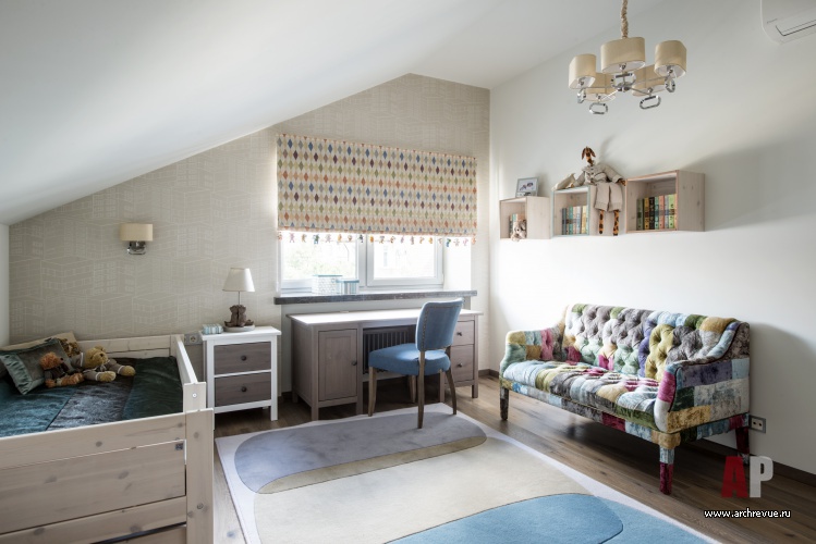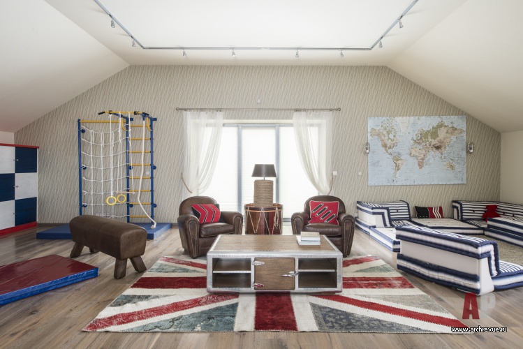 Но, пожалуй, самое выдающееся помещение – игровая комната со скошенным потолком. Она разделена на две части: детскую игровую и лаунж для взрослых.