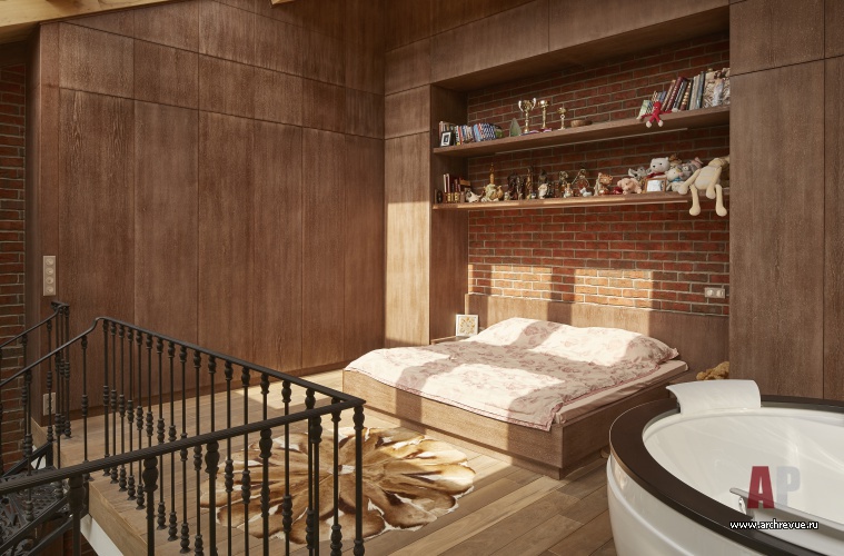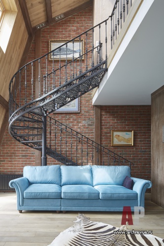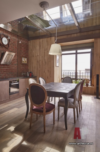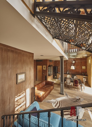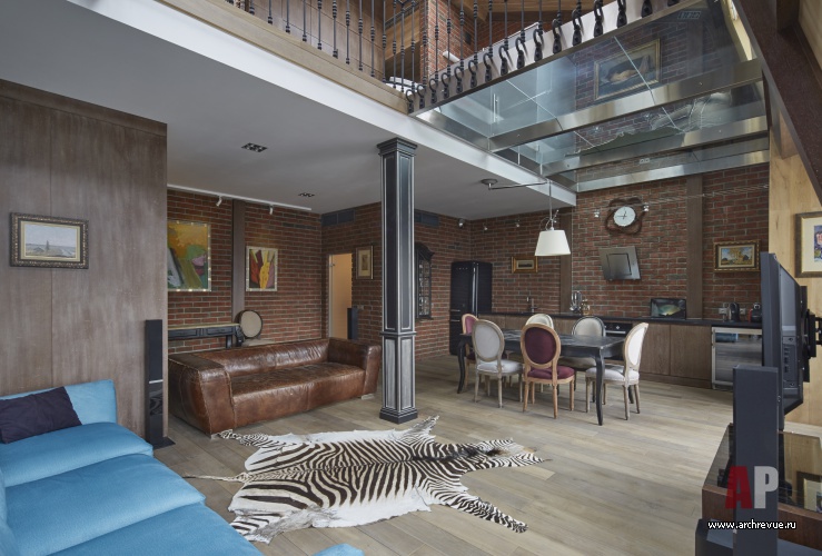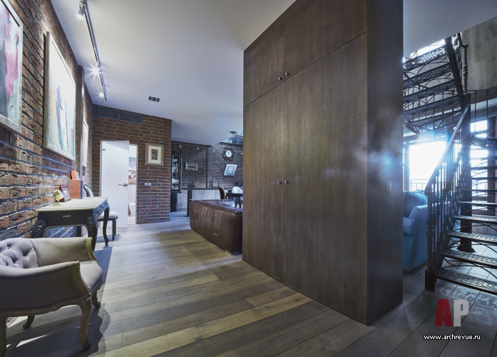 Интерьер апартаментов решен в стилистке классического лофта: кирпичные стены, технологичные светильники, кожаная винтажная мебель, выполненная по чертежам черная кованая винтовая лестница. Чтобы сделать интерьер более уютным и обитаемым, архитектор предложил зашить фасадную стену и потолок инженерной дубовой доской. Похожая, но под маслом, уложена на полу. Важную роль в дизайне лофта играет система шкафов (гардероб на первом этаже и мебельная композиция с кроватью на втором).