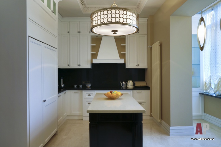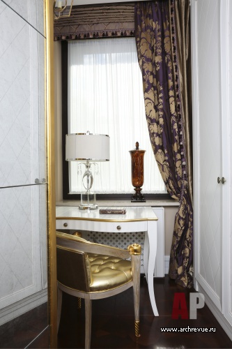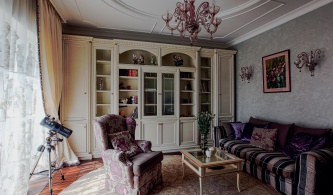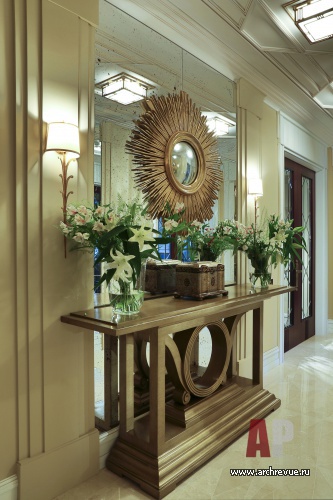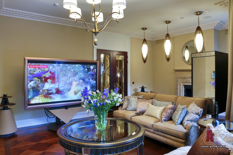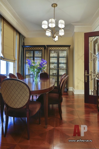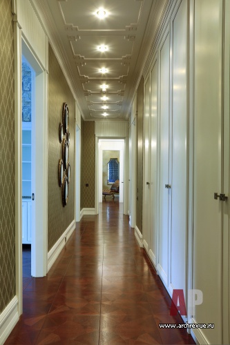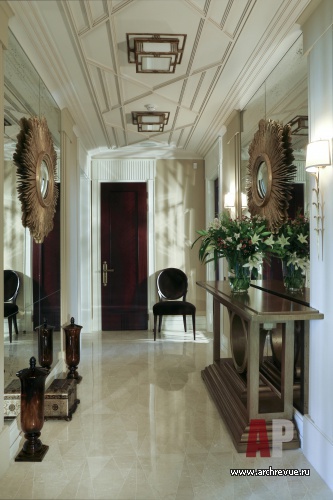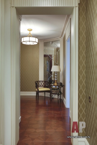 Семейная квартира имеет традиционную для консервативного жилья планировку с изолированными помещениями. Парадный холл с длинным коридором делит квартиру на две равные по значению части: гостевую и приватную. На общественной половине располагаются гостиная, столовая, кухня.